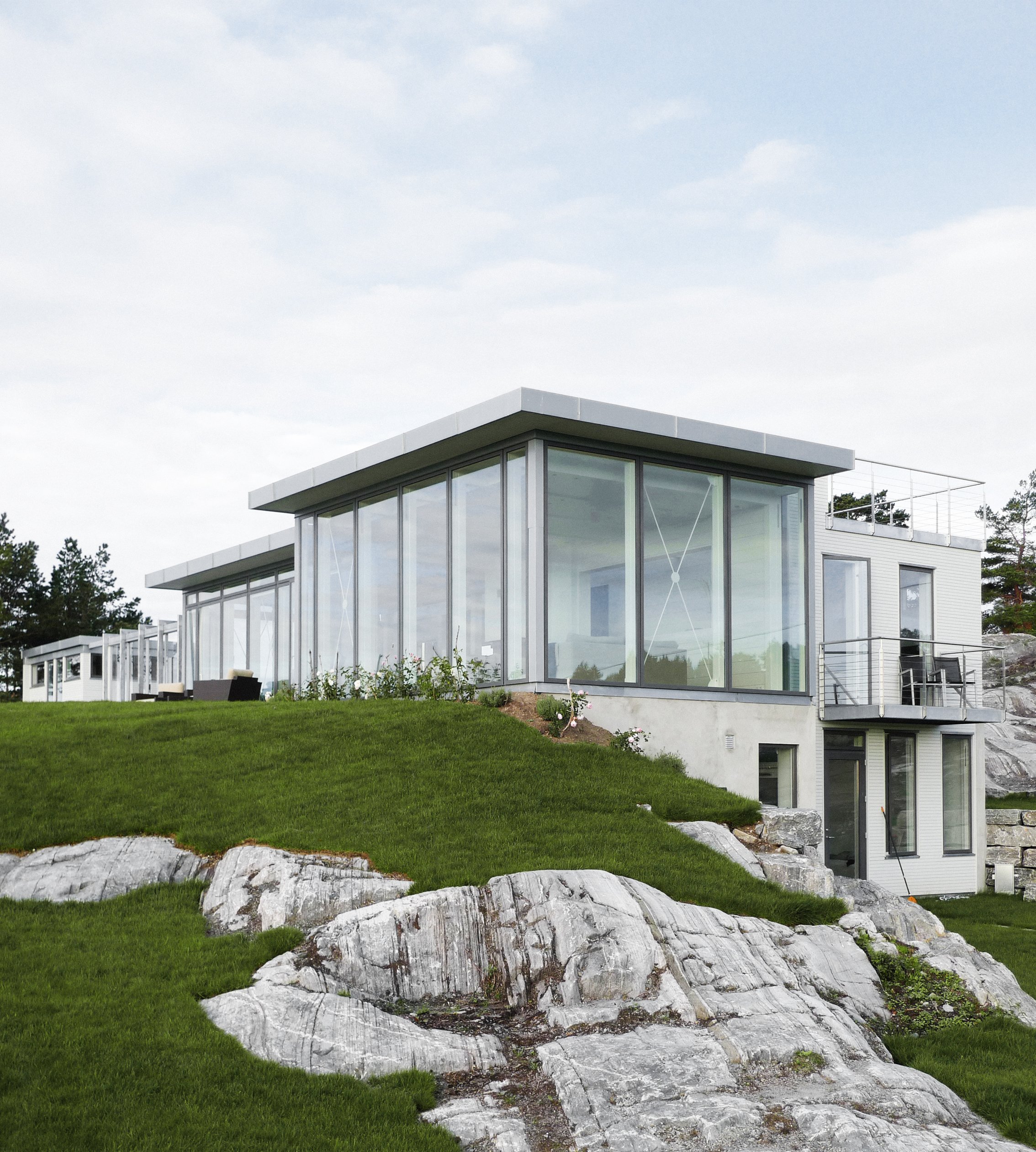 En spennende akse gjennom hytteanlegget binder sammen basseng, bod og de ulike etasjene/nivåene. Hytta er en ren limtrekonstruksjon med vektlegging av en maksimal åpenhet og utsikt mot sjøen i et 270 graders perspektiv. Samtidig er den tydelige aksen benyttet til vindskjerming av uteareal ved bassenget, og tydeliggjøring av den private delen av anlegget.