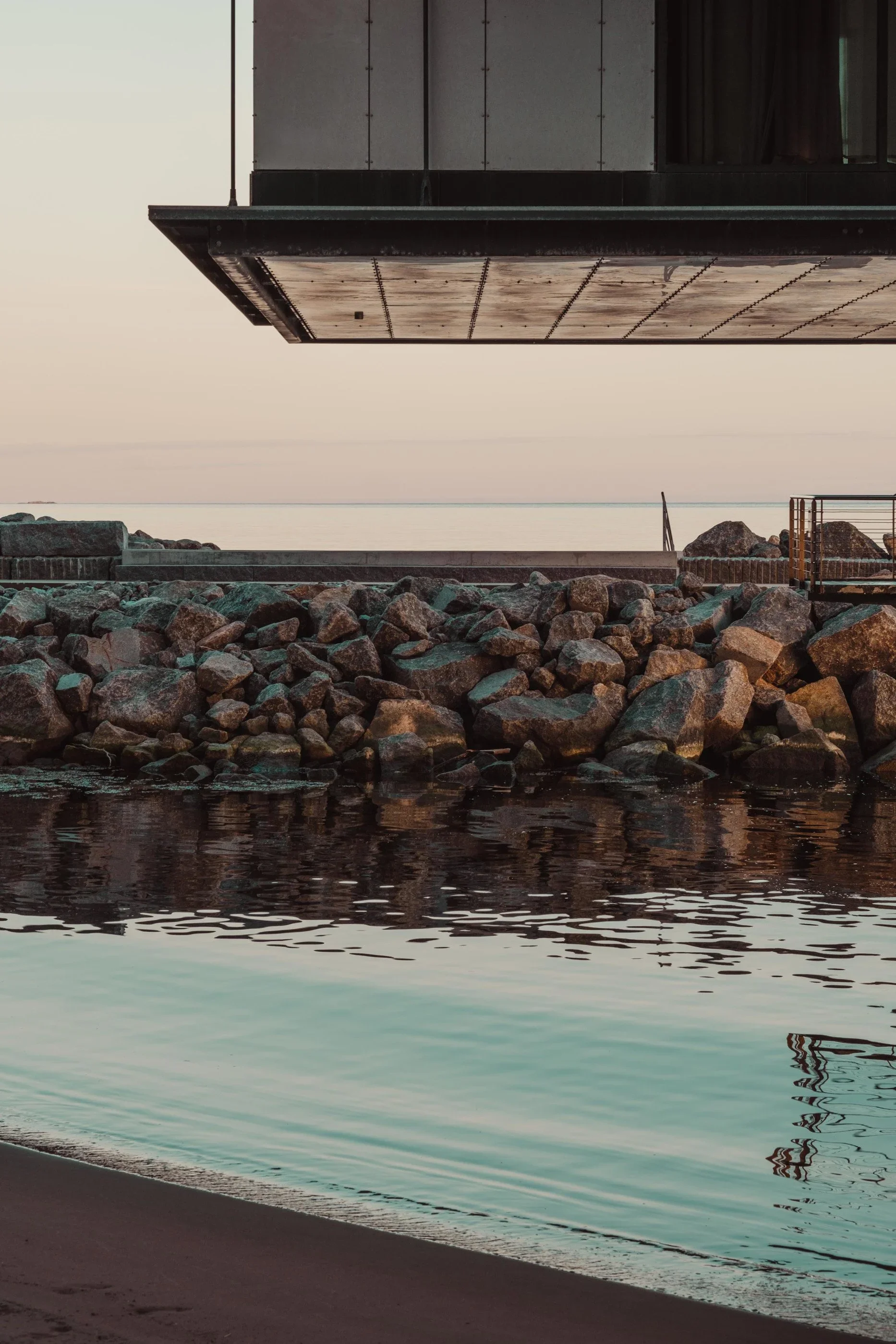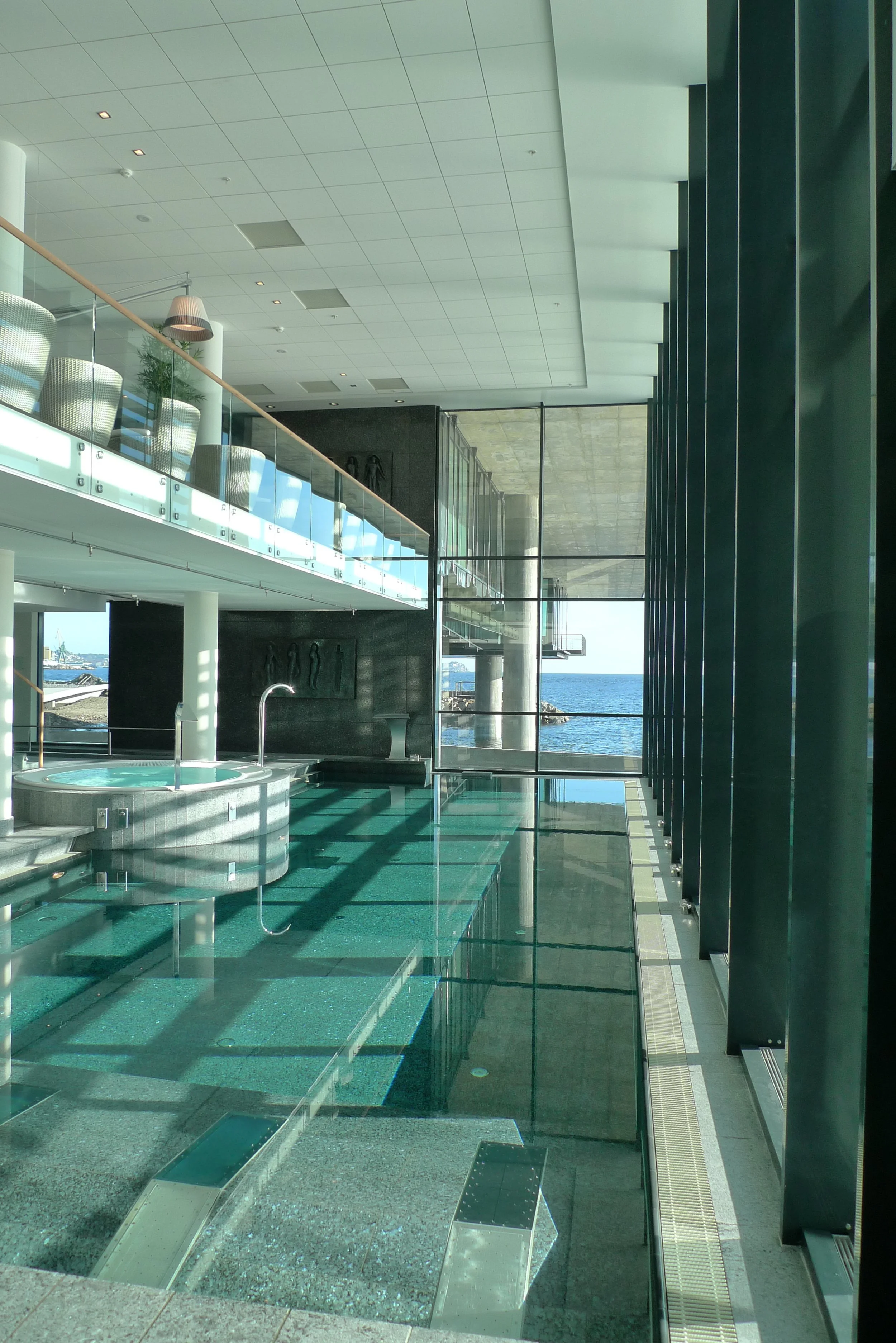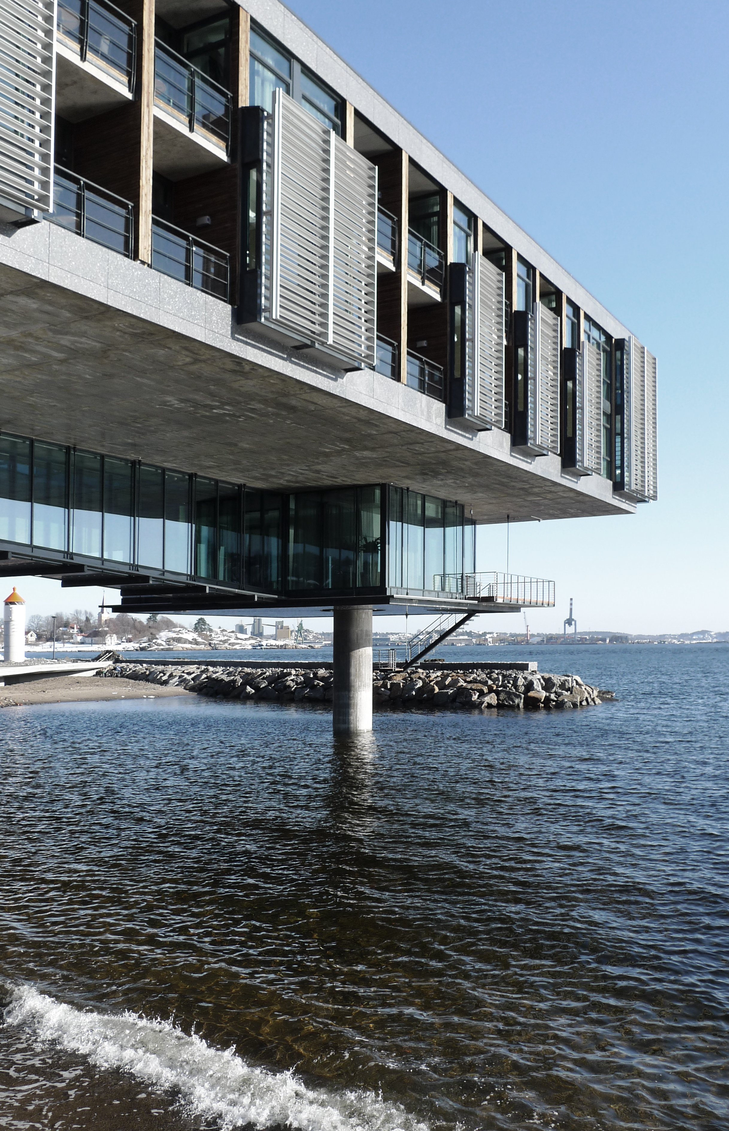 Bygget har 177 hotellrom beliggende i en firkant rundt et atrium, der atriet er åpent mot fjorden på to sider. To av romfløyene krager ut over strand og sjø, og spenner 24 meter fritt ut til en enkelt søyle i fjorden. På stranden ligger SPA-avdelingen, og en innglasset bru under den ene romfløyen gir tilgang til et hengende glassvolum rundt søylen i havet. Herfra kan det, til alle årstider, bades fra en nedsenkbar trapp.