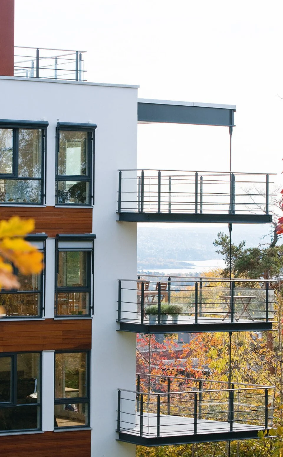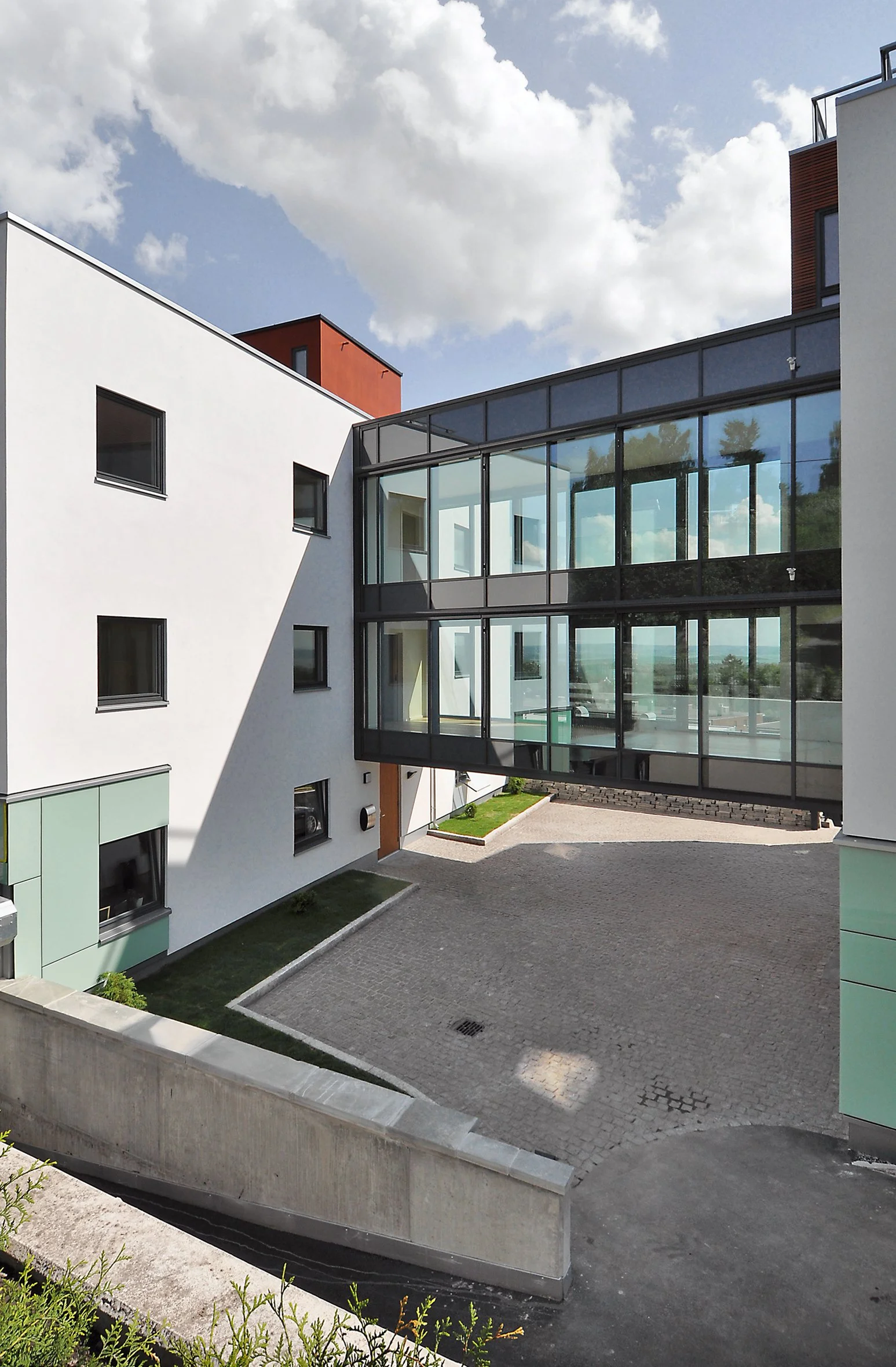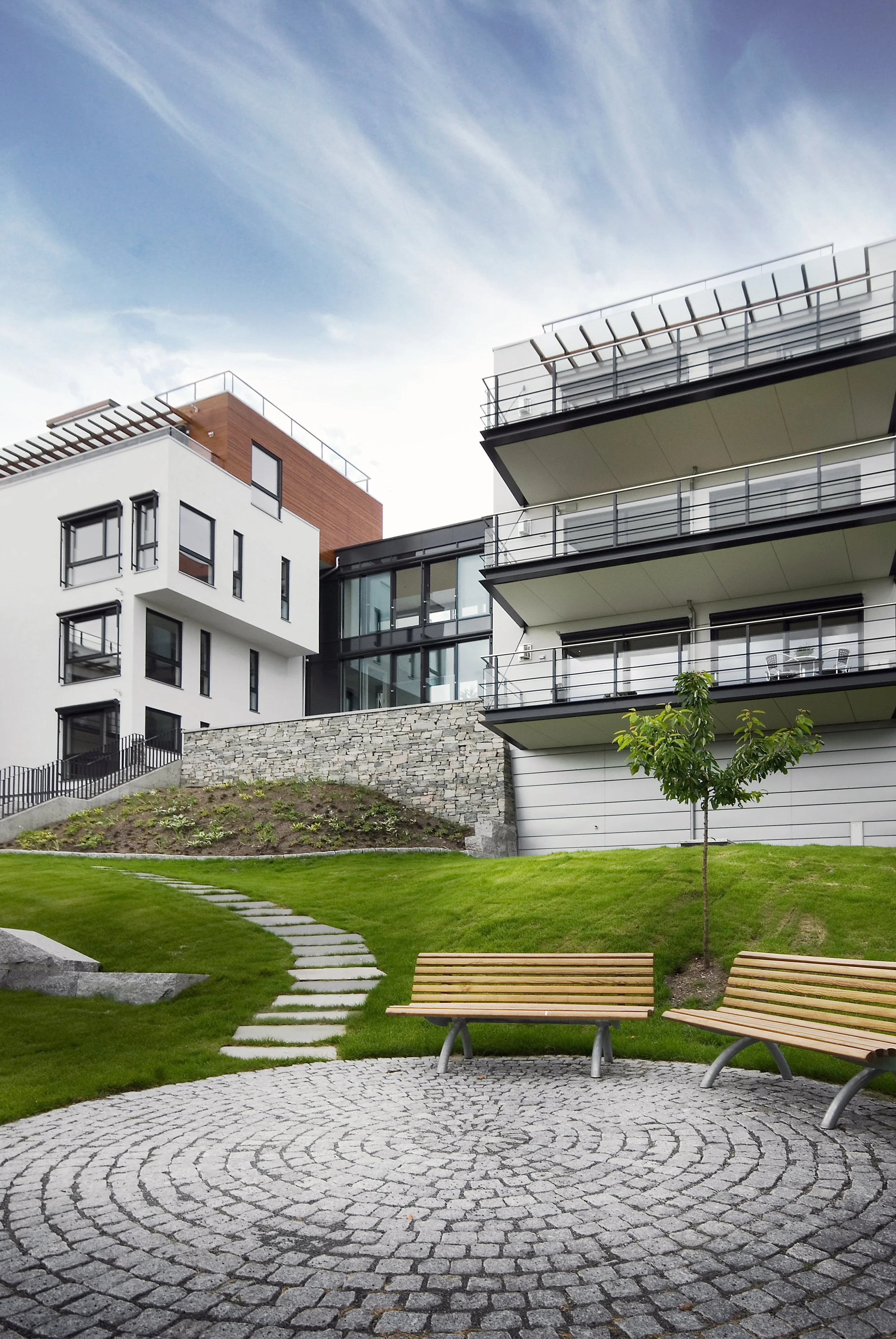 De lange fasadene er brutt opp ved at bebyggelsen trappes med terrenget, og ved at første etasje mot vei er gitt et transparent preg.