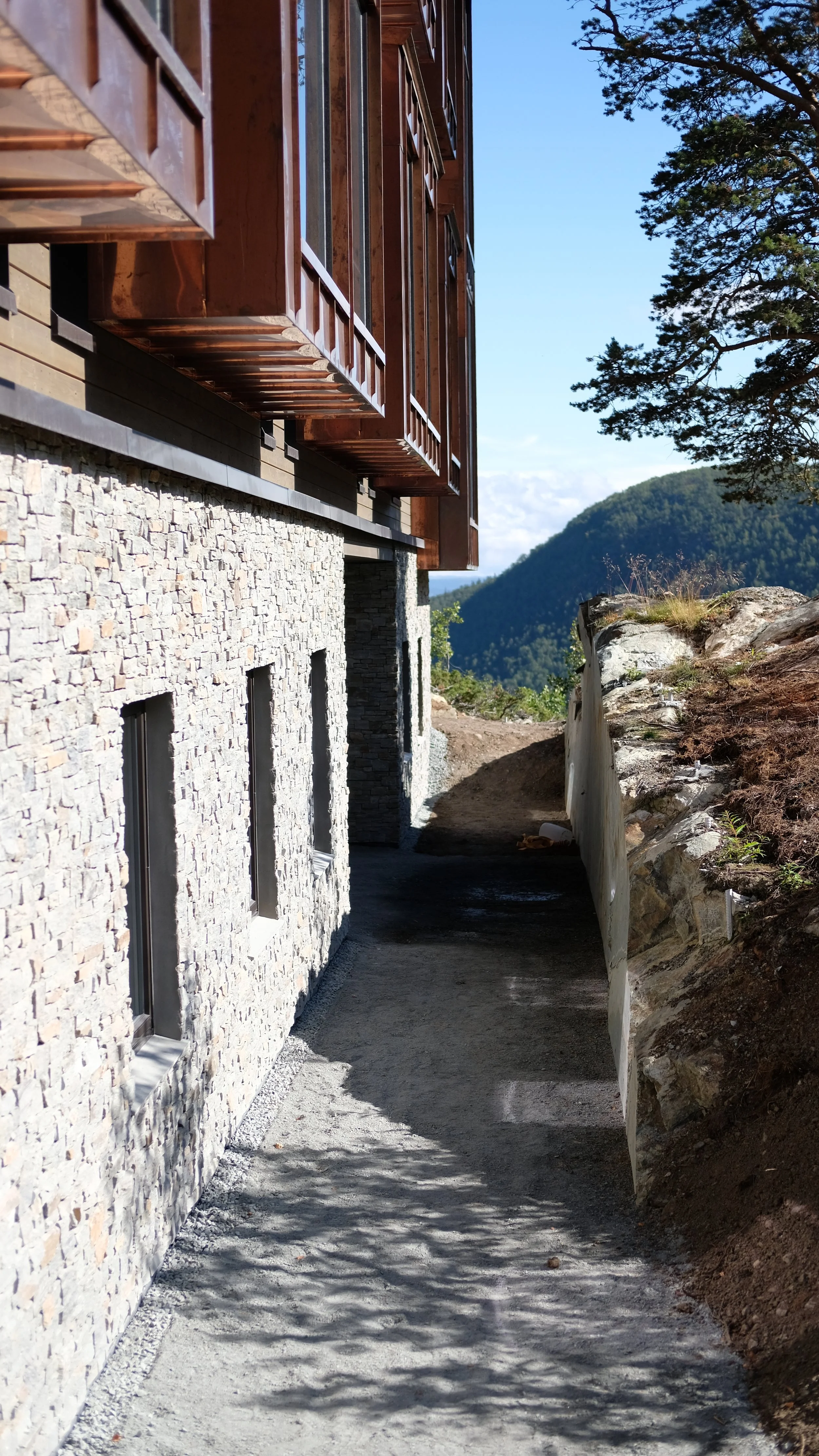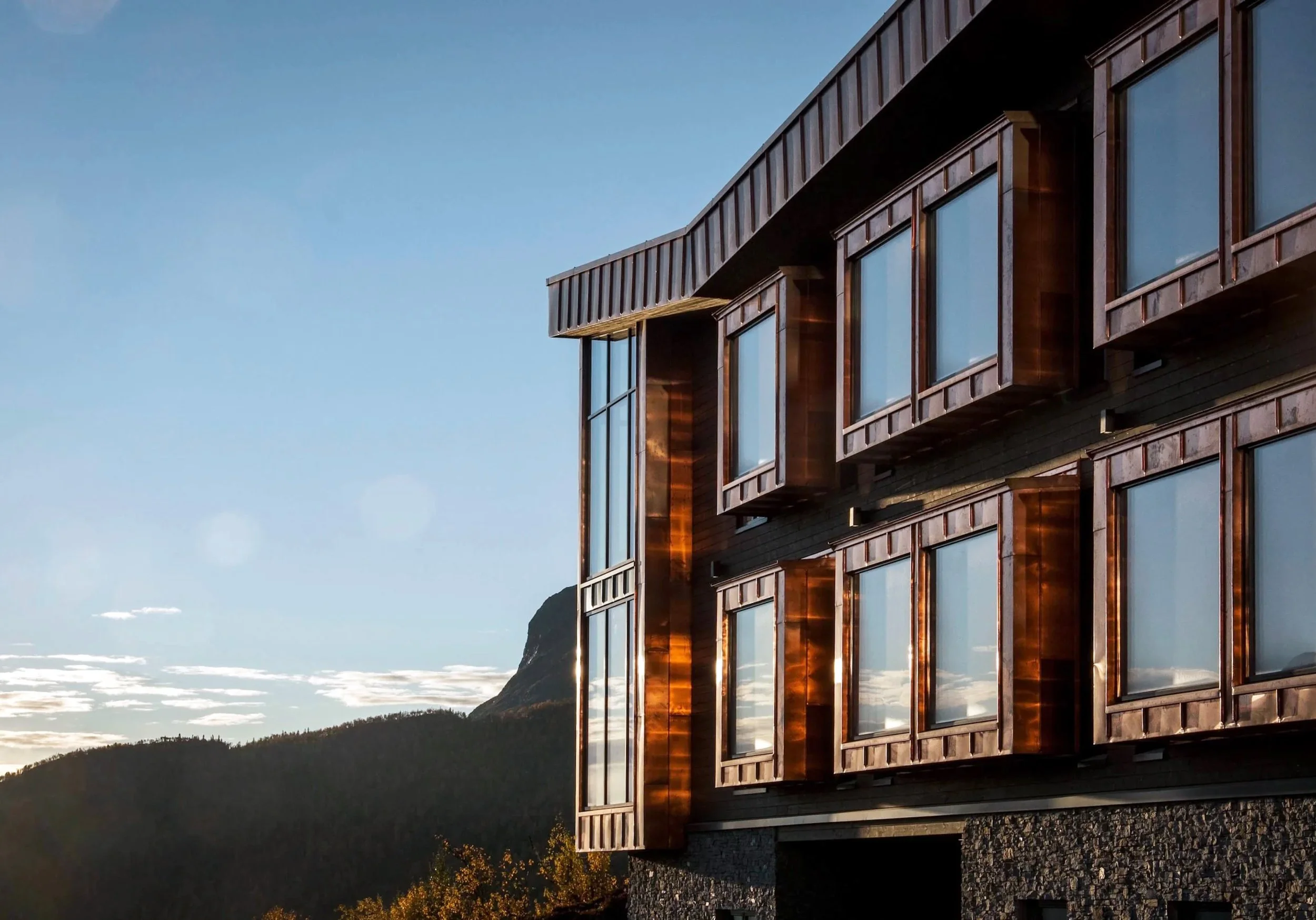 Byggets plassering, som følger terrenget nedover mot øst, bevarer utsiktsforholdene i den gamle hotelldelen samtidig som det sørges for direkte kontakt med fjell og natur. Materialiteten i prosjektet spiller videre på farge -og materialpaletten som omgivelsene viser frem, og manifesterer seg blant annet i form av furukledning, kobber og steinmur med innslag av rustrøde toner. De naturlige omgivelsene speiles også innvendig, med en palett hvor jord -og rusttoner får lov til å dominere. Resultatet er et prosjekt som har både utfordret og begeistret, med en plassering og en kompleksitet som har vært spennende å jobbe med.
